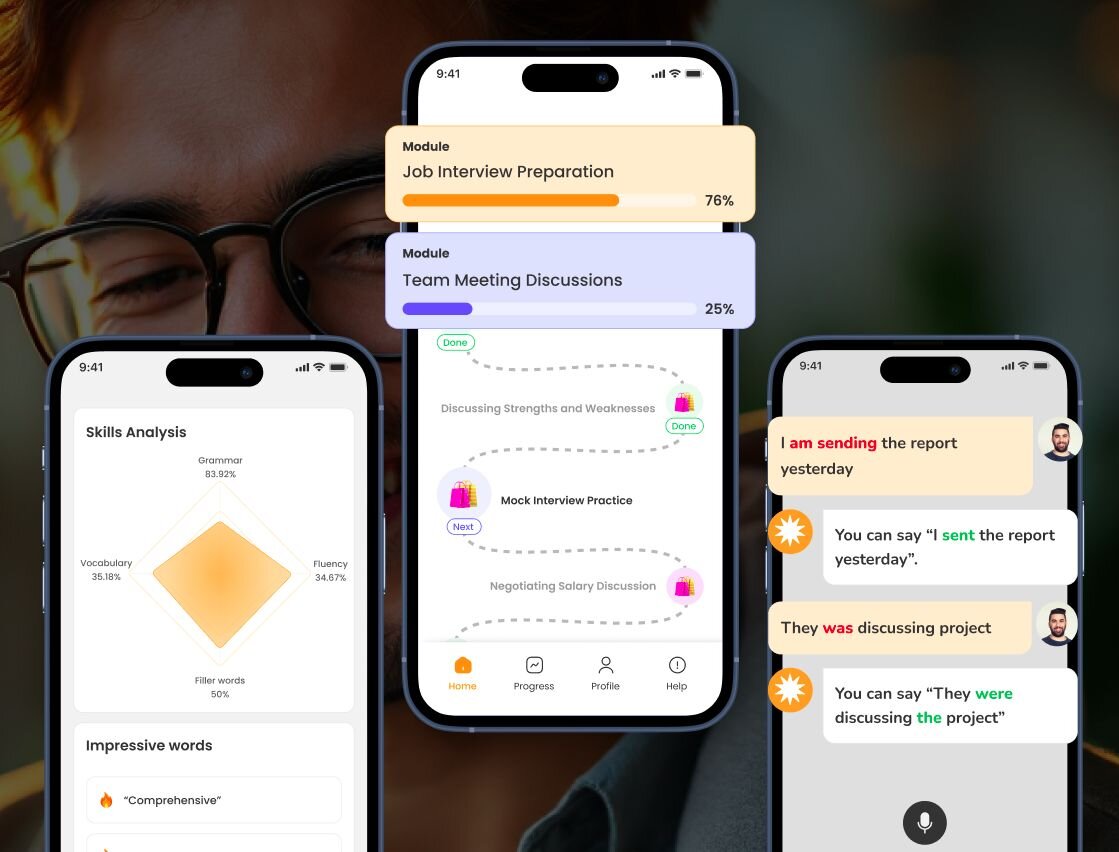 Practice job interviews, business presentations, travel situations, and daily conversations at your level with Katie AI.